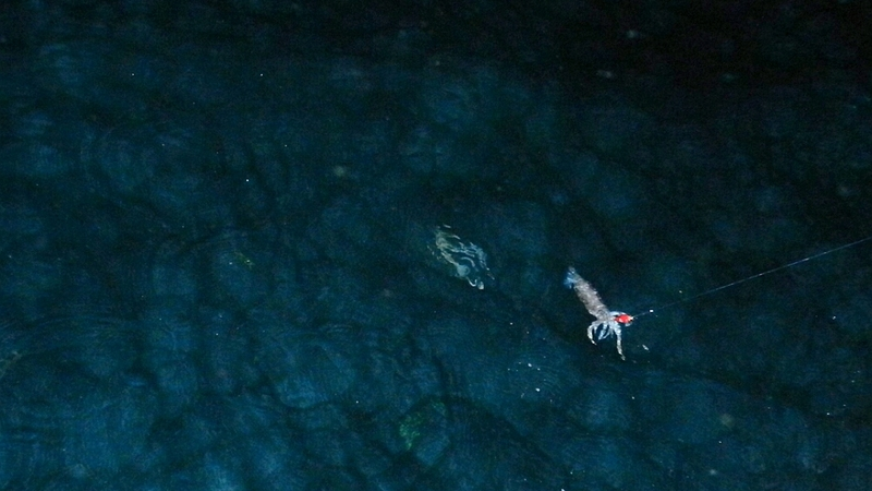 На свет бросилась мелкая рыбешка, причем я смог определить только два вида этой мелочи – японский анчоус и песчанка. Еще были какие-то рыбки, которые извивались как маленькие змейки, но их поймать не удалось, сачок был со слишком крупной ячейкой. Эта мелочь носилась в свете прожектора как угорелая и явно что-то ела. Присмотревшись, я увидел массу мелкого криля (сиби). В свою очередь, на мелкую рыбку охотился кальмар – выходил откуда-то из глубины, делал резкие рывки, догонял малька… Секунды – и на этом месте оставалась только горстка чешуек, которые, переливаясь всеми цветами радуги, привлекали других рыбешек.