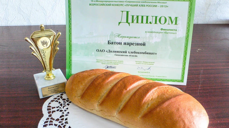 В мае текущего года в Москве в рамках 19-й Международной специализированной выставки по хлебопекарному и кондитерскому оборудованию и пищевым ингредиентам «Современное хлебопечение –2013» проводился Всероссийский конкурс «Лучший хлеб России –2013». Продукция Долинского хлебокомбината получила высокую оценку жюри конкурса и стала победителем в двух номинациях: «Хлеб ржано-пшеничный заварной» и «Батоны из пшеничной муки высшего сорта». В этом большая заслуга всех тружеников предприятия.