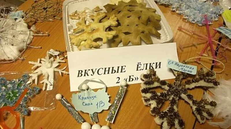 Какие бывают елки? Живые, конечно! А еще нарядные, сказочные, с серпантином, игрушками и гирляндами. Но гимназисты придумали своих красавиц. Фантазии не было предела. Пожалуйста, на выбор: из вощеной бумаги и яркого картона, из воздушных шариков и фольги, из соломы и тафты и даже, что совсем необычно, – из дисков, перчаток и клубков. А больше всего многие гости удивились «вкусным» елочкам из карамели и мандаринов и снежинкам из печеного теста. Но настоящим хитом стало лесное деревце из панцирей морских ежей. Его чаще всего разглядывают как дети, так и взрослые.