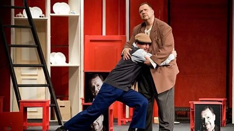 Но вот ведь чего давно не случалось на нашей сахалинской сцене. Еще и слова не сказал герой Андрея Кошелева. Еще лишь, тяжело дрогнув, начинают расползаться в стороны тяжелые створки бархатного «дежурного» занавеса. А зритель уже заворожено погружается в театральное действо. Потому что в этот раз сценография спектакля полностью соответствует его идейно-сюжетному решению. Высокие, нависающие над актерами стены коммуналки, переполненные шкафчиками, полочками, дверочками, наглядно демонстрируют страшную задавленность маленьких людей, их унылую зависимость от материально-низменных понятий вроде регулярной, пусть мизерной, зарплаты.
