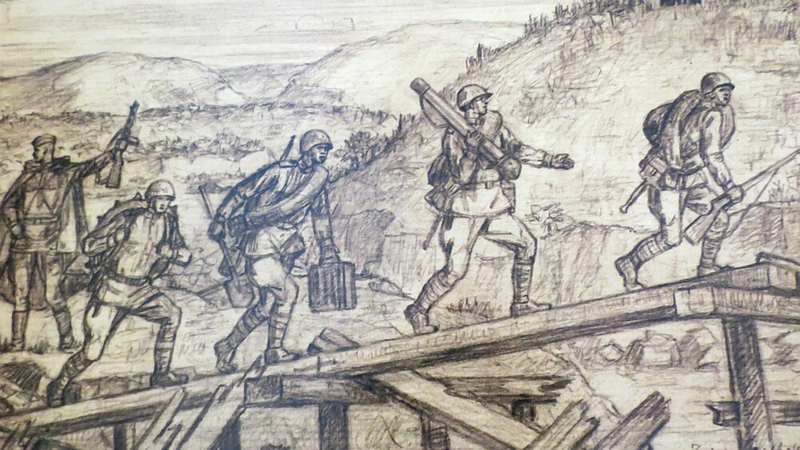 Каждая работа художника – подлинная история, рассказанная непосредственным участником событий. К примеру, на переправе через реку Суньхэ огнем своего миномета сержант Горлач уничтожил большую группу находящихся в засаде японских смертников с пулеметами. За проявленную смелость боец был награжден медалью «За боевые заслуги». Теперь эту операцию минометчика мы видим на рисунке.