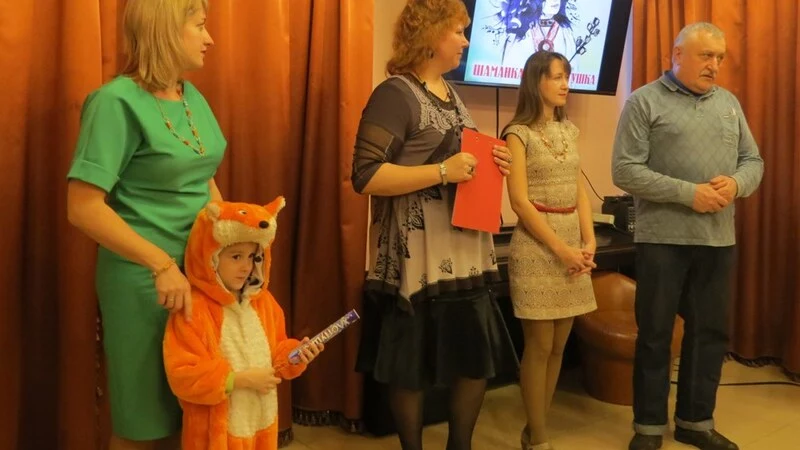 Презентация аудиокниги о шаманке началась с труднообъяснимых помех, словно какие-то таинственные силы пытались внести свои коррективы. В проекции на полотно уже появился силуэт танцующей шаманки с бубном, но у юного участника вечера в костюме Лиса-божества с первого раза не сработала хлопушка. Только с третьего раза запустился компьютерный файл с записью аудиокниги «Шаманка горы Лягушка».