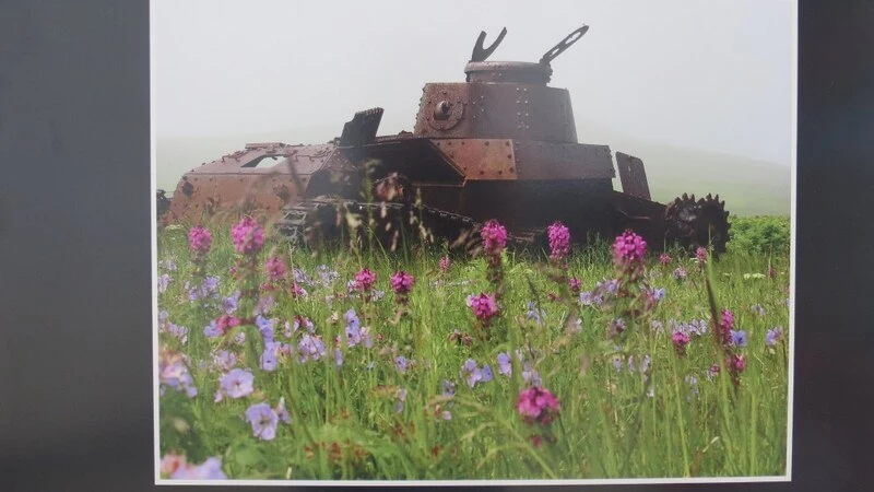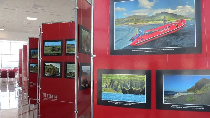 Выставка «Острова ратной славы» открывается снимками, сделанными на острове Шумшу, там, где в 1945-м началась Курильская десантная операция. На склоне горы Северной до сих ржавеет японский танк «Чи-Ха».