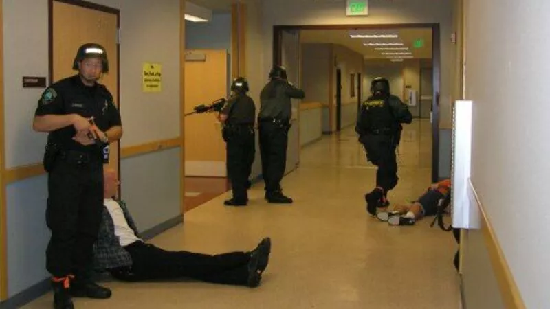Что же касается тактической подготовки, то наша ни в коей мере не уступает заокеанской, а в некоторых случаях превосходит ее. Если бы полицейские так входили в школу в реальной чрезвычайной ситуации, а не на учениях, то стали бы отличной мишенью для снайпера.