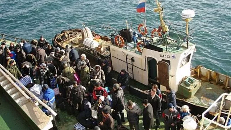 Наконец-то, наперекор жуткой болтанке, с грехом и матросским матерком пополам, трап все-таки удалось опустить на баржу. Он сильно елозит по железной палубе, издавая противный скрежет. Боцман дает команду на погрузку пассажиров…