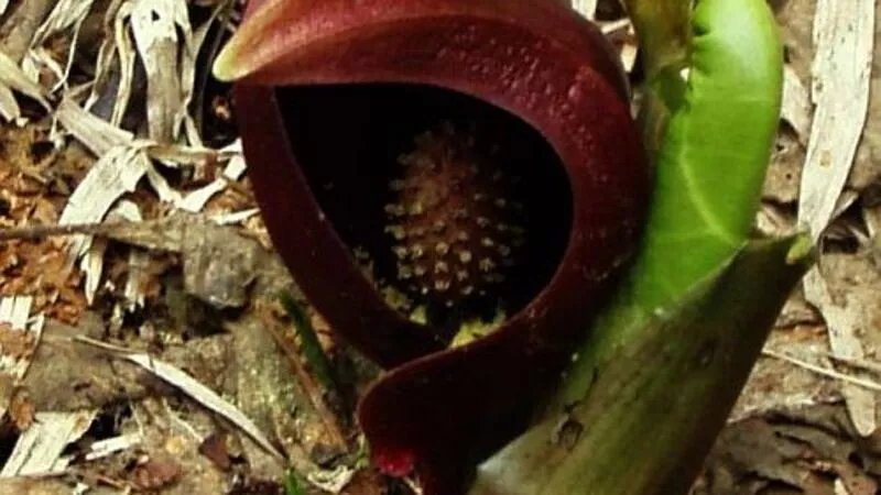 Цветки симплокарпуса скромны и незаметны, отчего они объединяются в компанию – плотное соцветие-початок. Цветет он очень рано, сразу после таяния снега, одновременно с калужницей. Экзотичный облик простосемянника не так уж прост. На мощный початок соцветия нахлобучен воинственный кроваво-красный шлем.