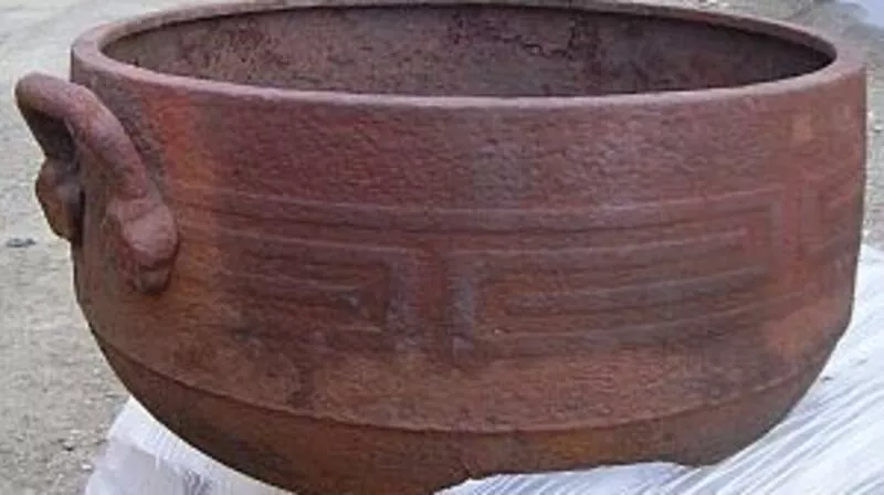 Я расскажу вам только о нескольких своих находках и назначении этого важного и легендарного предмета общечеловеческой истории. Мое знакомство с первым чугунным котлом Кама произошло за площадью Славы в Южно-Сахалинске, на террасе перед главным синтоистским храмом острова «Карафуто дзиндьзя», построенным в 1911 году. В 1925 году его почтил своим посещением и посадил перед ним сосну будущий император Японии принц Хирохито. Гуляя вдоль террасы, я увидел торчащий из земли край чугунного котла высотой 15–20 см. Заинтересовавшись, я раскопал его полностью. Высота котла составляла 70 см, а диаметр верхней части – 1 м 38 см. Подобные котлы я часто встречал в разбитом и целом виде на морском побережье юга Сахалина.