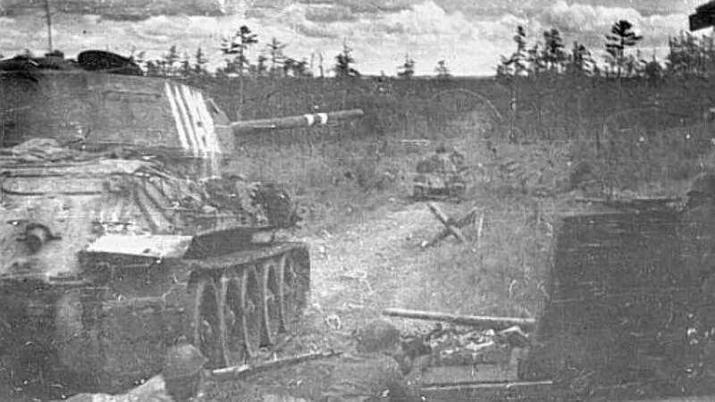 Разведчики-пехотинцы выяснили обстановку в районе бумажной фабрики в Эсутору (Углегорск). Здесь было светло как днем: фабрика горела, полыхали гигантские штабеля бумаги.
