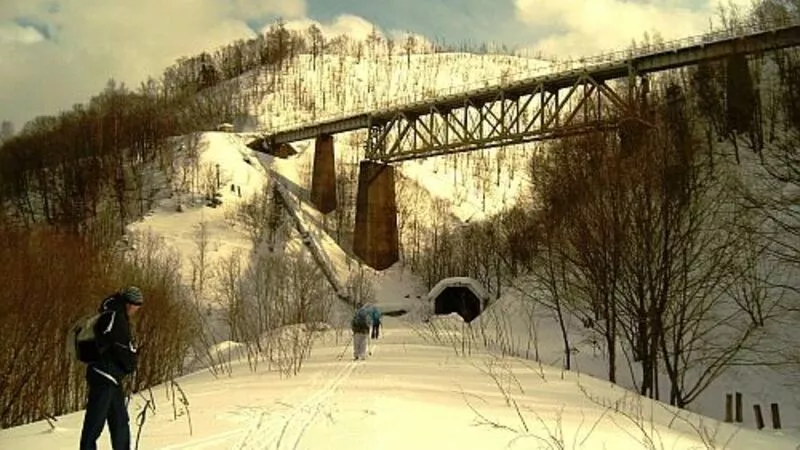 И все-таки больше всего нас поразила одна из главных достопримечательностей этой части маршрута – Чертов мост. Это уникальное инженерное сооружение – с тоннеля дорога сразу выходит на мост, а с моста почти сразу в тоннель. Для меня это было одним из самых страшных моментов похода – боязнь высоты усугублялась разрушенным железнодорожным полотном. Но я перешел этот мост. Мой друг перебежал его первым и сразу принялся фотографировать. Людей тут бывает немало, в сторону от дороги даже протоптана тропинка на площадку, откуда можно сфотографировать местную знаменитость. Спирально закрученный тоннель – действительно невиданное сооружение и полет инженерной мысли. Длина его почти километр, ощущения внутри него совершенно нереальные, с трудом верится, что мы выйдем из него. Но мы вышли и двинулись дальше. Это была самая удивительная прогулка по Сахалину и железной дороге, которая так и просится в наш день.