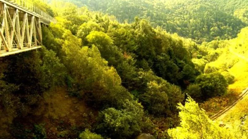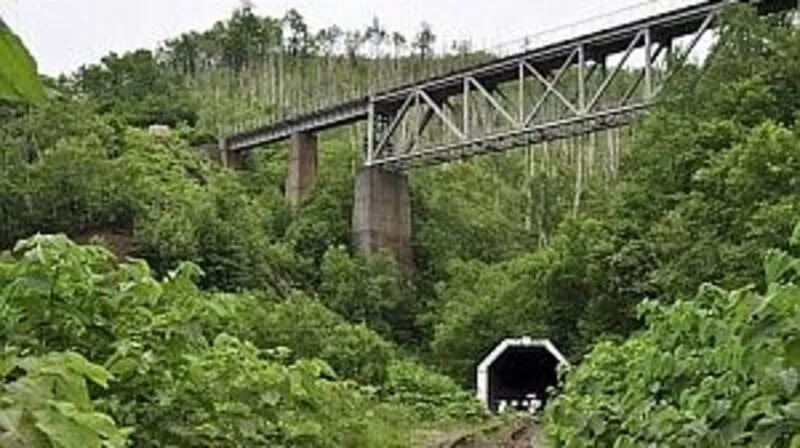 Так называемый сахалинцами Чертов мост находится в районе станции Николайчук Холмского района. Уникальное железнодорожное сооружение построено японцами в 1920-х годах. Поезд проезжал по этой дороге через два тоннеля, выезжал почти на самую вершину сопки и проходил по сооруженному Чертову мосту на высоте 38 метров, откуда видна красивейшая панорама островной природы.