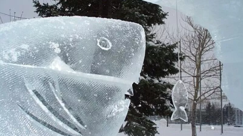 Возможно, именно таких курьезных моментов и не бывает в жизни, но в ледовой композиции это смотрится весьма реалистично, и главное, красиво. Кроме «морозостойкой акулы», которая вот-вот схватит попавшую на крючок рыбешку, здесь можно в деталях рассмотреть и других обитателей морского дна – конька, звезд, черепашку.