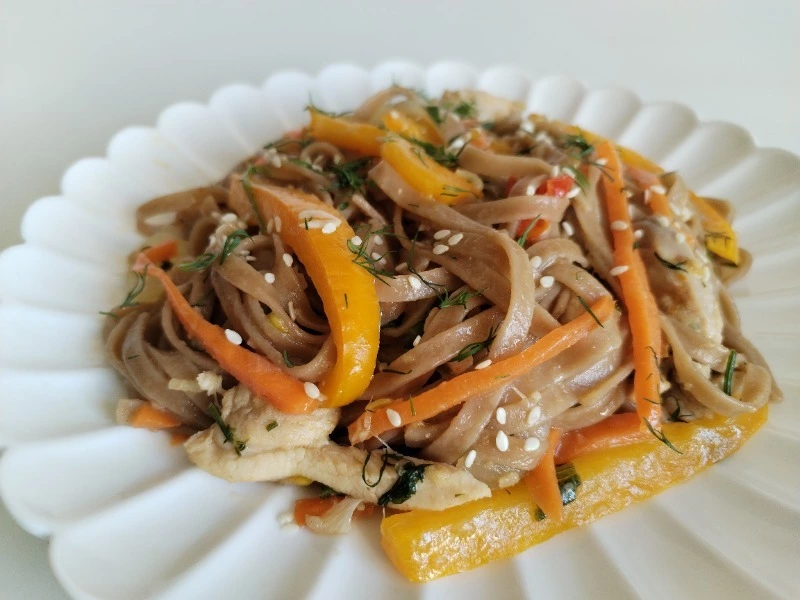 Яркое, сытное и очень ароматное блюдо получается из гречневой лапши в сочетании с курицей и овощами. Готовить его достаточно просто и быстро, ингредиенты вполне привычные и доступные, их можно заменять при желании, а результат — вкусный и полезный обед или ужин с лёгкой восточной ноткой для всей семьи.