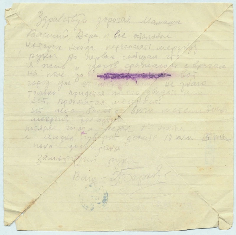 «Добрый день, дорогие родители, Мама, Вася, Костя, Оля, Ира, Вова, Муся, Ляля, сестра Вера (далее текст не читается, предположительно, затёрто военной цензурой — прим. автора), ну и остальные друзья и знакомые, перечислять некогда — пишу на поле боя: свистят пули, рвутся снаряды, я ещё жив и здоров, но уже крещён снарядом, благодаря глубокому окопу меня только оглушило. Я три дня плохо слышал, и присыпало землёй, а в остальном всё в порядке, участвовал уже в двух атаках, конечно, немцы боятся русского штыка и крика «ура», бросают всё и отступают.