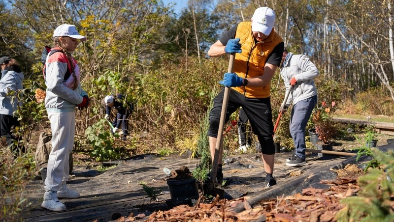 К назначенному времени на центральной площадке ботанического сада по улице Горького волонтеры пришли со своими семьями, друзьями и близкими. И вот работа пошла: мужчины расчищали площадку от сорняков и веток, копали и возили грунт, женщины занимались посадками, дети, вооружившись метелками, убирали мусор. Работали слаженно и дружно — за десять лет сотрудничества ботсада и проекта «Сахалин-1» многие из сотрудников регулярно посвящают свои выходные общественно полезному труду.
