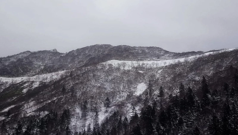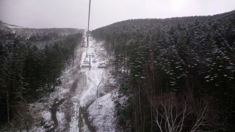 На белесом фоне выделяются темно-зеленые пихты и оранжевая лиственница. Внизу стелется зеленый бамбук. Краски осени еще царят в это время года. Следует отметить, что попасть на канатную дорогу «Красная-Юг» осенью не просто: она часто не работает из-за сильного ветра. Зимой та же история, но зимой, «в сезон», доступ на канатку до вершины Красной возможен только для горнолыжников и сноубордистов. Так что улучить момент, чтобы прокатиться на Красную, поистине удача.