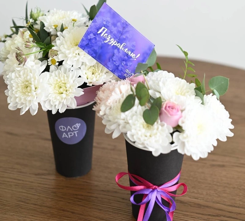 Неплохой бюджетный вариант — мини-букет в бумажном стаканчике. Он даст ощущение уюта, легкости и искренней заботы. Подойдет как знак внимания для тех, кто не любит пышные букеты в нескольких слоях упаковочной бумаги. Кроме того, в некоторых студиях флористики придумали комбо: мини-букет привозят вместе со стаканчиком кофе.