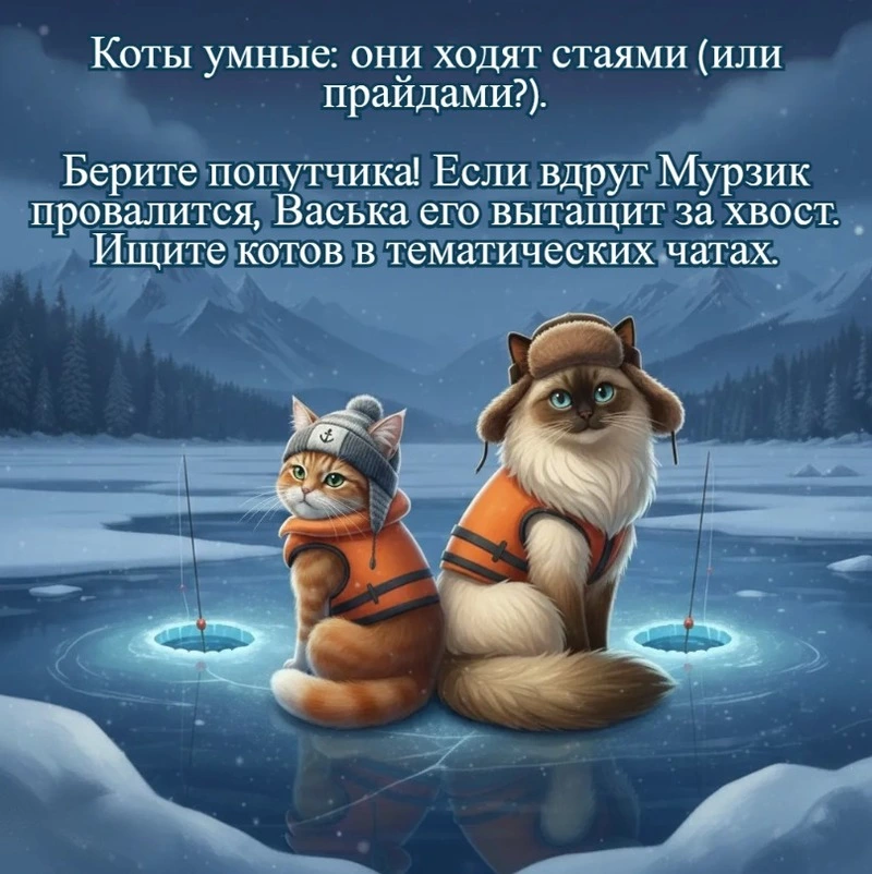 Мурзик — кот самостоятельный и неглупый. Он знает: даже если ты супергерой, на льду нужен напарник. Мало ли что: то ли рыба слишком большая попадется, то ли лед решит испытать на прочность. Вдвоем веселее и безопаснее.
