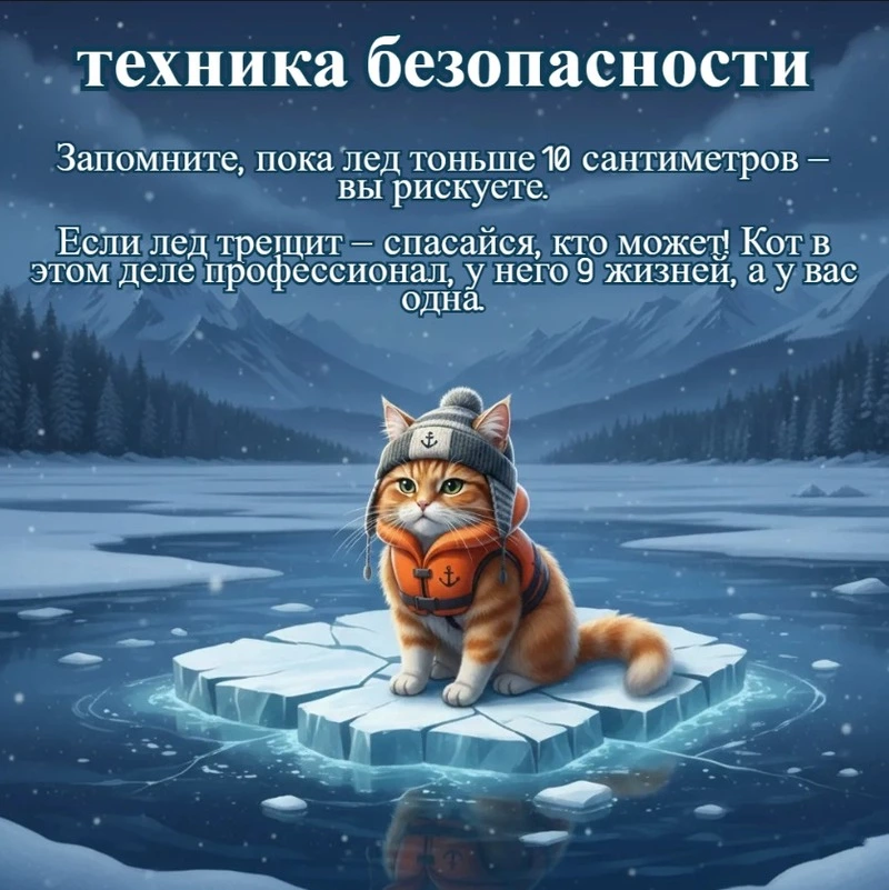 Знаете, почему коты редко тонут? Потому что они семь раз отмерят, один раз отрежут. Вернее, постучат. Мурзик настоятельно рекомендует не повторять глупости из интернета, где блогеры бегают по тонкому льду ради хайпа. У вас, в отличие от кота, всего одна жизнь.