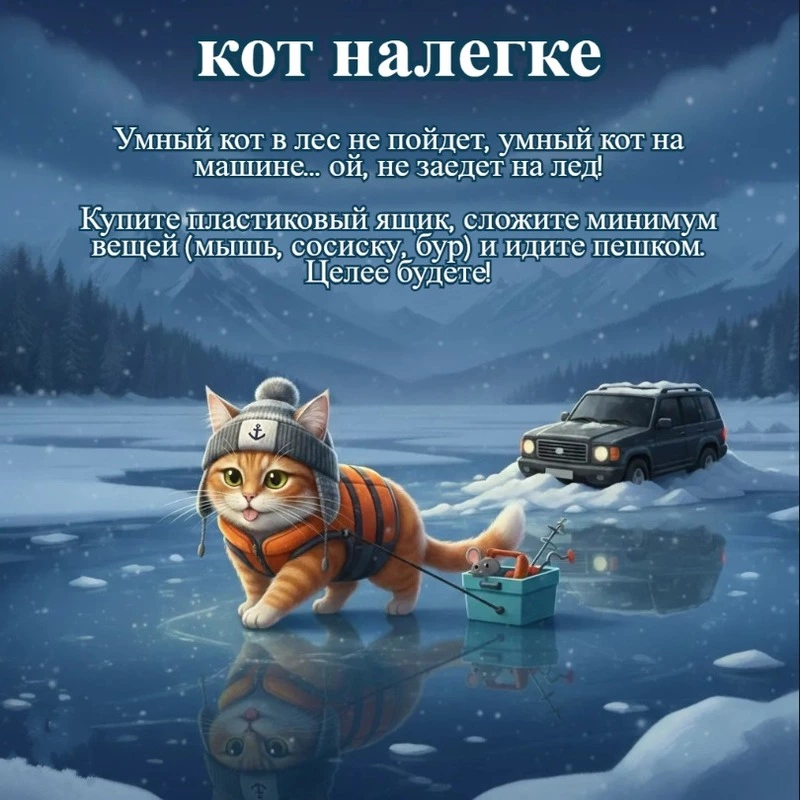 Заключительный совет от Мурзика. Каждую зиму он видит одну и ту же картину: люди пытаются заехать на лед на машинах, буксуют, застревают, а иногда и проваливаются. Кот Мурзик предпочитает передвигаться на своих четырех. Надежнее так.