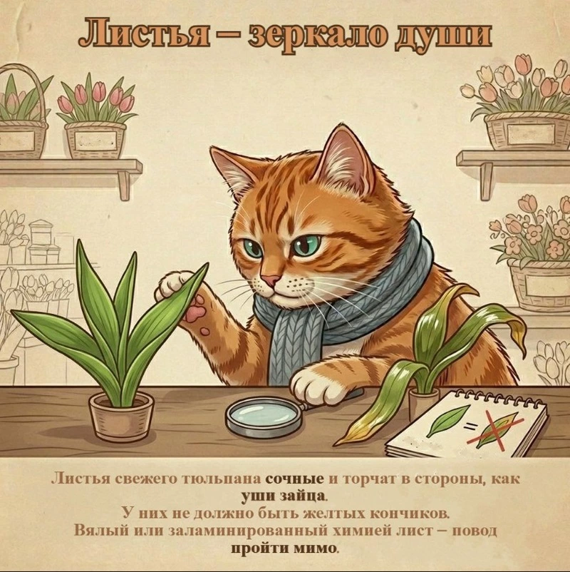 Мурзик с лупой напоминает: настоящий товарный вид не нужно делать. Он виден сразу. Сканируйте каждый цветок на честность. Если есть подозрение, что красоту навели лоском — проходите мимо.