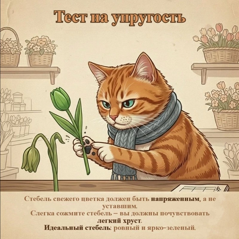 Запомните это ощущение: легкий хруст при сжатии — это звук идеального тюльпана. Стебель должен быть тугим, упругим и сопротивляться вашим пальцам.