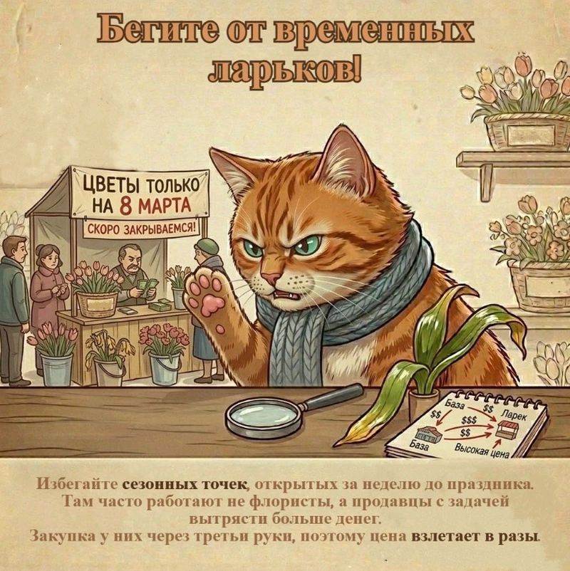 Видите палатку с табличкой «Цветы только на 8 Марта», которая выросла за неделю до праздника как гриб после дождя? Бегите! Там работают не флористы, а временщики с одной задачей: вытрясти из вас максимум денег.