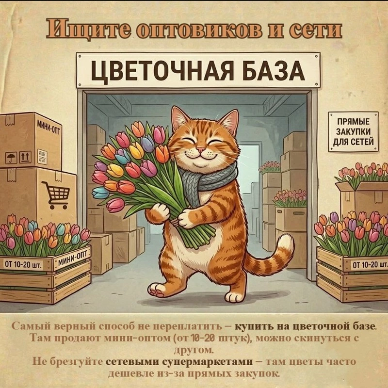 Лучшие друзья вашего кошелька — цветочные базы и крупные сетевые магазины. На базах можно купить мини-оптом (от 10-20 штук), и это отличный повод скинуться с подругой или коллегами. А в супермаркетах часто прямые поставки от производителей, поэтому цены приятно удивляют.