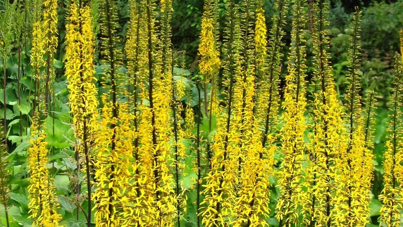 Забудьте про папоротники. Бузульник — это мощные, резные листья на высоких красных черешках, которые создают вертикаль. Его желтые «свечки» взлетают на 1,5 метра вверх.