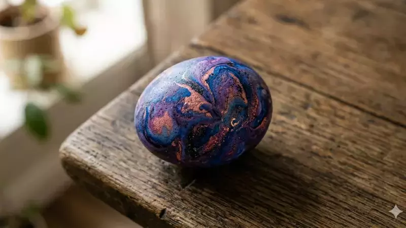 Лайфхак: распылите пенку горкой на тарелку, капните туда 3-4 оттенка: ультрамарин, фиолетовый, розовое золото и каплю черного. Зубочисткой сделайте ровно 5 круговых движений (не больше) — иначе цвета смешаются в грязь. Обваляйте вареное яйцо в этой пене, подождите 5 минут. Смойте холодной водой. Вы получите рисунок, напоминающий снимок телескопа.
