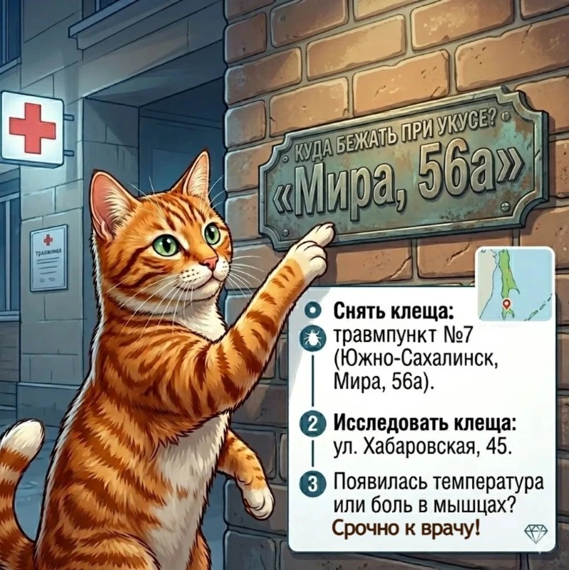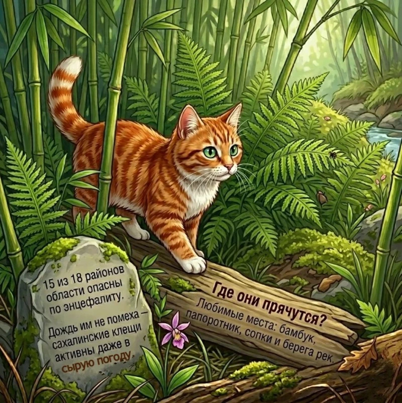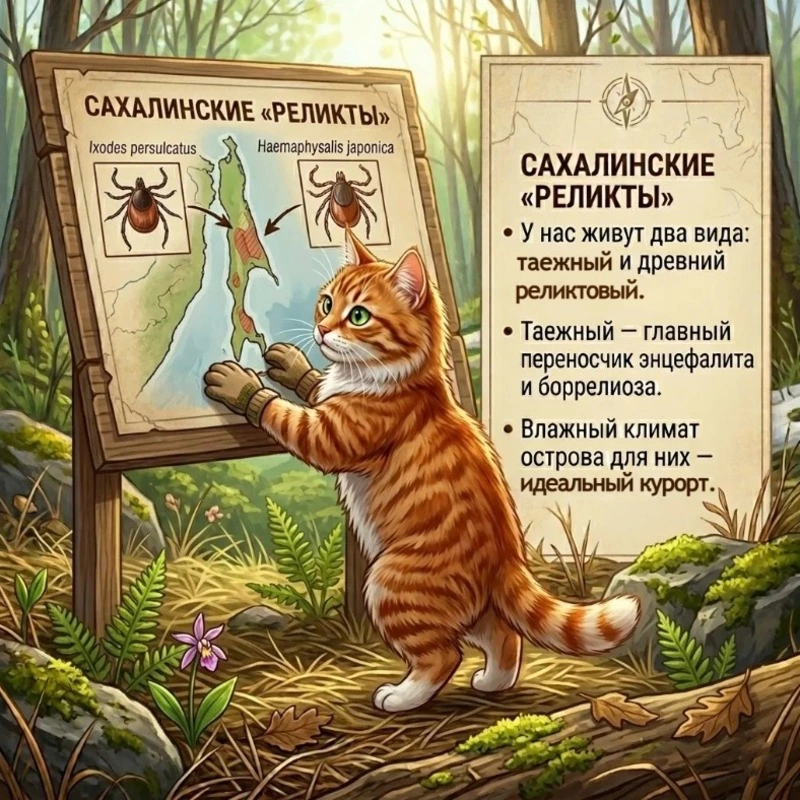 В 2026 году из-за аномально раннего схода снега первые нападения паразитов на Сахалине зафиксировали уже 31 марта, что заставило надзорные ведомства объявить режим повышенной бдительности. Чтобы жители острова не запутались в графиках вакцинации и правилах безопасности, кот Мурзик подготовил наглядную инструкцию на основе нашего предыдущего материала о ситуации с клещевым энцефалитом в регионе. Разбираемся, где на Сахалине самые опасные зоны, как правильно одеваться в лес и куда нести «врага», если он все-таки успел присосаться.