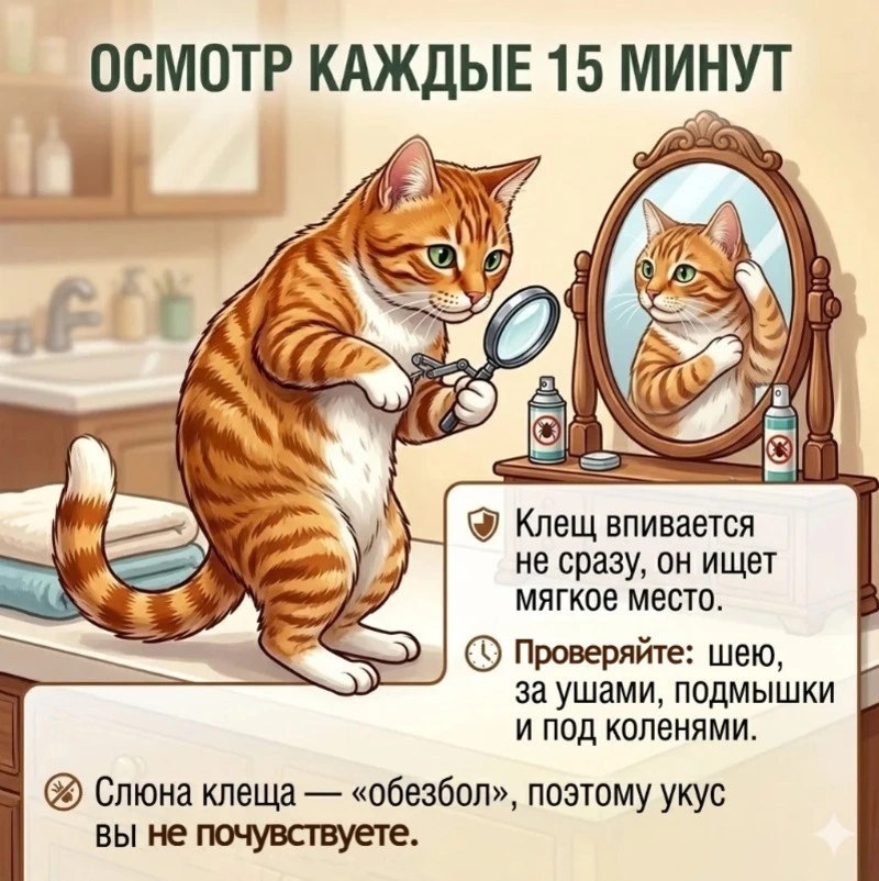 Клещи хитрые и кусают без боли. Осматривайте шею и зону за ушами каждые 15 минут прогулки.