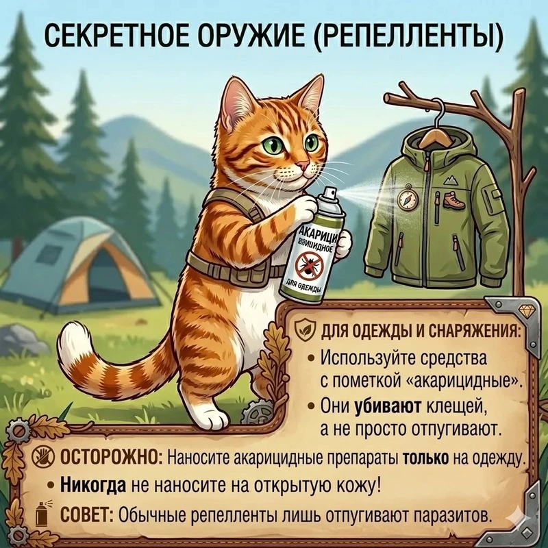 Используйте акарицидные средства. Помните: брызгаем только на куртку и штаны, а не на кожу!