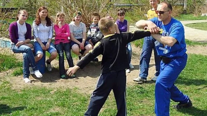 Затем Владимир Иванович продемонстрировал приемы рукопашного боя. Дети завороженно смотрели на выступление инструктора, в глазах – желание быть такими же сильными и ловкими.