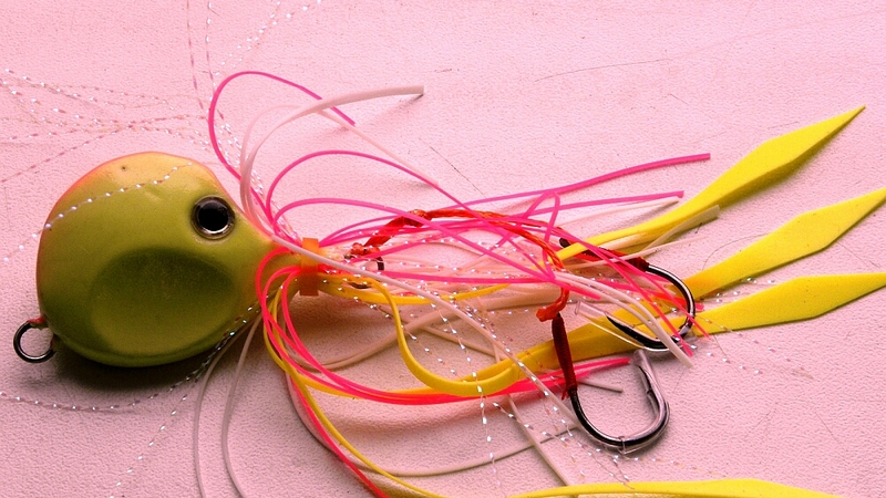 Второй вариант оснастки – прямо на грузило одеваем силиконовую мочалку разных цветов. Можно сделать ее из щупалец отслуживших свое октопусов. В мочалке прячем крючок на коротком, пятисантиметровом поводке. В этом случае перед грузилом нужно обязательно поставить шок-лидер или что-то типа поводкового материала, который нельзя перекусить. Крючки – только одинарные, лучше всего, если они будут спарены – каждый на своем поводке. Размер крючка такой же, как на симу, – нужно, чтобы он смог пронзить и зацепить окаменевшую пасть рыбы.