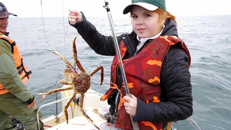 Действительно, хороший эхолот – это глаза рыболова: благодаря прибору, он видит и профиль дна, и наличие рыбы. Сначала в толще воды, примерно на 17 метрах, проплывала мелкая рыбешка, затем в том же направлении двигалась камбала, а за ней шли камчатские крабы. Крабы вообще нас удивили – им настолько понравилась наша японская наживка, что они умудрялись доставать ее даже с верхнего крючка. Так и представляю себе подпрыгивающего в толще воды краба…