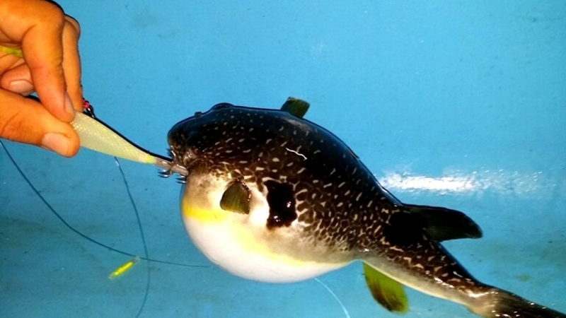 Отошли недалеко от порта, сначала половили окуней, а как стемнело, стали искать кальмара. Море в зыби, после шторма еще не успокоилось (в такую погоду кальмар попадается штучно, больше стоит на глубине), но мы упорно продолжали ловить, уж очень хотелось свеженького кальмара... Ловили до полуночи – дальше только время тянуть или надеяться на чудо. В результате поймали на всех меньше десятка головоногих и несколько штук рыбы фуга. Удивительно, но фуга попадалась на крючки кальмарницы.