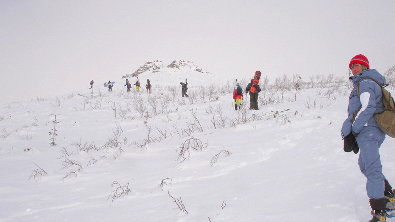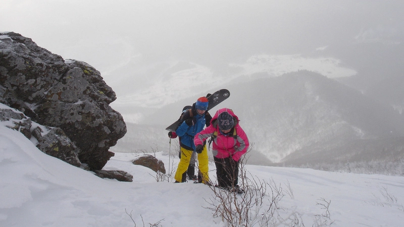В группе были смельчаки, предлагавшие продолжить подъем, но мой должным образом не натренированный организм молил о пощаде. А поскольку оказалось, что идти дальше тяжело не только мне, коллегиально решили двигаться в обратном направлении. Тем более что метель и низкая облачность скрывали те красоты, ради которых мы поднимались. Так что лыжники и сноубордисты с нескрываемым удовольствием умчались в распадок, а неудовлетворенная «пехота» побрела вниз с надеждой отыграться в следующий раз.