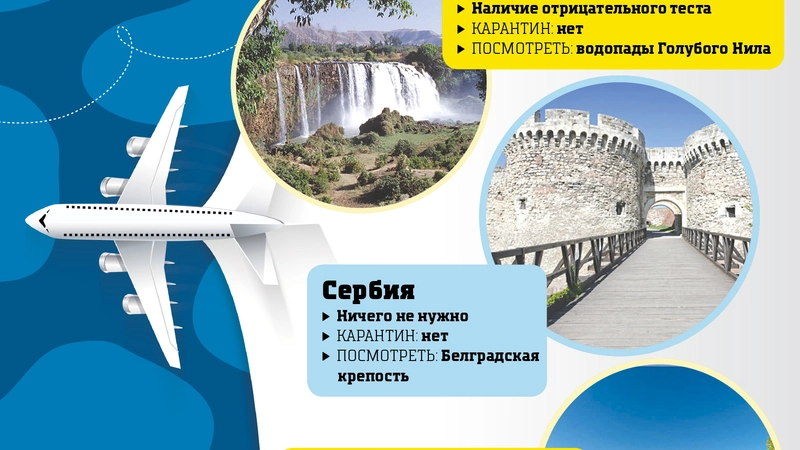 Сербия оказалась единственной открытой страной, для поездки в которую не нужно сдавать тесты на коронавирус и проходить карантин. Она встретит вас живописными пейзажами, древними крепостями, монастырями и вкуснейшей балканской кухней. Эфиопия - совсем не заезженная россиянами страна, но самые искушенные туристы могут попробовать отдохнуть и там, в частности - на водопадах голубого Нила.