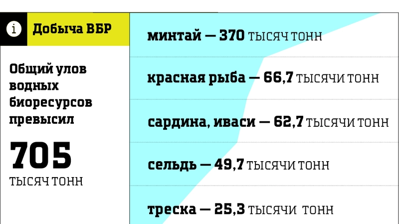 – Другая его часть приходится тоже на востребованные потребителем виды. Хотя прогноз на лососевую путину не сбылся, но, по уточнённым данным, добыто 66,7 тысячи тонн красной рыбы. Одновременно хорошая промысловая обстановка и значительное увеличение добывающего флота позволили в несколько раз нарастить темпы добычи сардины иваси, отгрузив её 62,7 тысячи тонн. Следующими шли сельдь (49,7 тысячи тонн), а также треска (25,3 тысячи тонн). В прошлом году, конечно, вёлся промысел краба, креветки, осьминога, кальмара и других видов водных биоресурсов.
