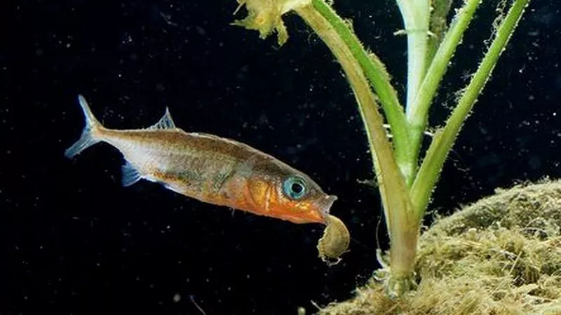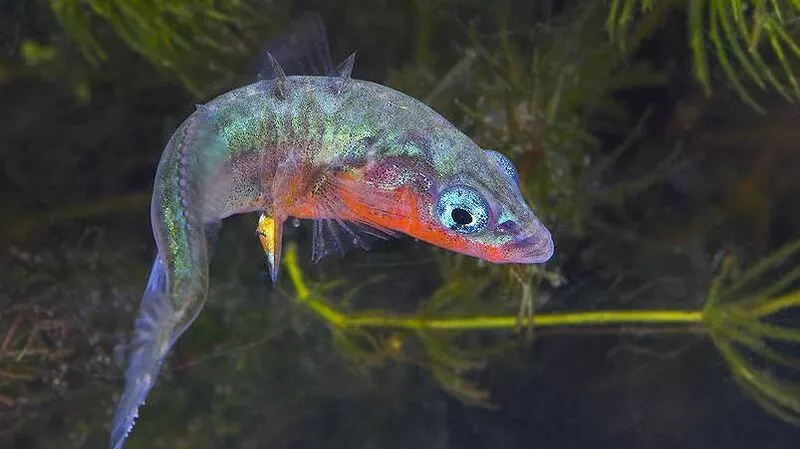 Самцы девятииглой колюшки предпочитают более скромный наряд. На фоне черного тела выделяются лишь синевато-белые брюшные колючки.