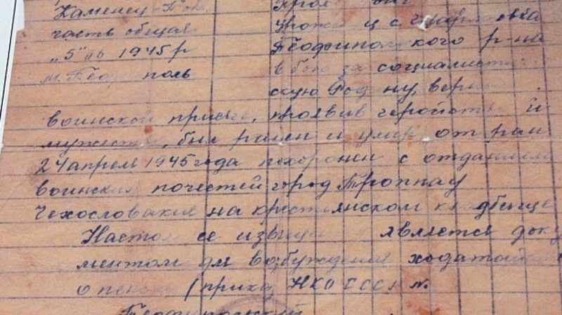 С особым трепетом Ю. Миранович достает из-под стекла «похоронку». Сколько горя принес в дома этот документ, представляющий обычный в линеечку тетрадный лист, на котором размашистым почерком адресат извещался о смерти близкого родственника. Представленная похоронка датирована 5 июня 1945 года. В ней уточняется, что погибший Романюк Дмитрий Прохорович погребен на кладбище в Чехословакии.