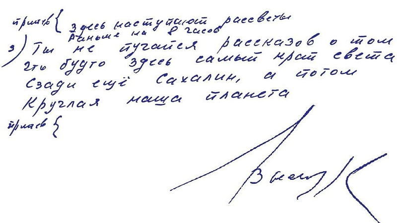 В рукописи одной из его песен есть строчка: «Ты не пугайся рассказов о том, что будто здесь самый край света, дальше еще Сахалин, а потом круглая наша планета». Эти строки из песни, написанной Высоцким в Приморье, и упоминание о нашем острове ничего сами по себе не доказывают. Но вот другой факт. О нашем городе Высоцкий упоминает в магнитофонной записи его рассказа о встрече с первым космонавтом планеты – Юрием Гагариным. И там можно разобрать такую фразу: «Случилось это… как раз перед самой моей поездкой в Караганду и в Южно-Сахалинск…». Этот аудиофайл есть у К. Молчанова, который, кстати, первым в истории изучения магнитофонных записей обратил внимание, что именно центр островного региона, а не Сахалин, как писали об этом ранее, упоминается Высоцким в этой доброй байке о дружбе с космонавтами.