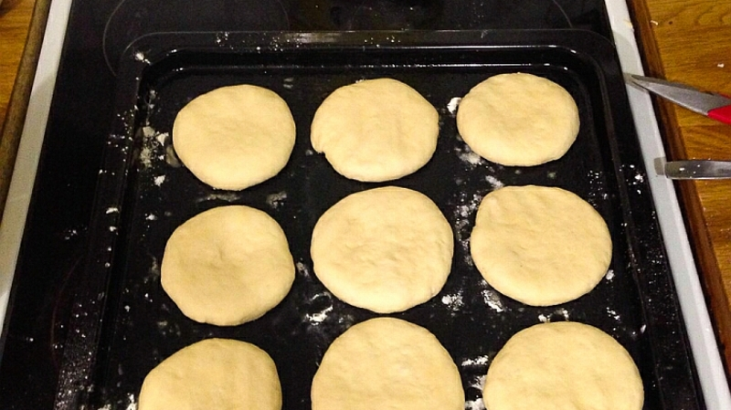 Затем засыпаем дрожжи, перемешиваем, даем постоять 5 минут и добавляем сливочное масло. Постепенно в эту смесь сыпем муку, вымешивая тесто. Смазываем его растительным маслом, накрываем полотенцем и убираем на час в теплое место. Оно должно увеличиться в объеме примерно в два раза. Раскатываем готовое тесто в колбаску, нарезаем на нужное количество частей. Из каждой части делаем сначала гладкий шарик, а затем разминаем его в диск толщиной 1 см, чтобы наши булочки получились плоские. Застилаем противень пергаментом, выкладываем диски на расстоянии не менее 3 см друг от друга и оставляем на 5 минут.