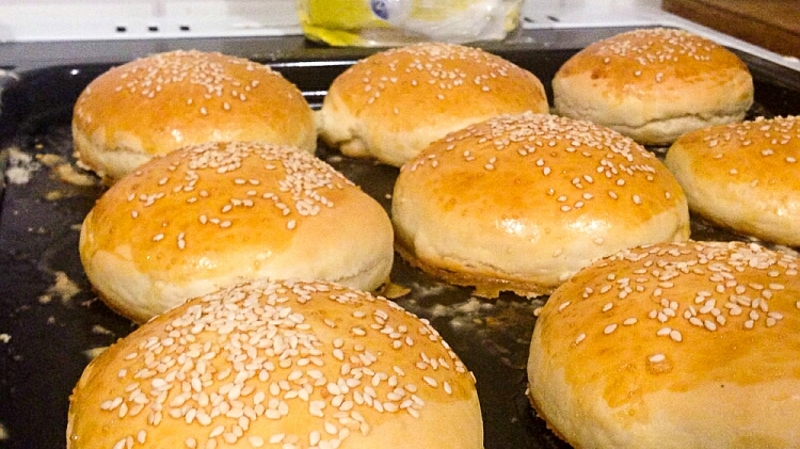 Многие знают: булочки для бургеров принято посыпать кунжутом. Если посыпать им сырое тесто, то кунжут, во-первых, осыплется, а во-вторых, булочка получится не румяная. Чтобы этого избежать, необходимо смешать желток со столовой ложкой воды и смазать этой смесью булки при помощи кисточки. Только после этого посыпать их кунжутом. Выпекать булочки 15-20 минут при 200 градусах. Еще один маленький нюанс: булочки надо выпекать в тот же день, когда планируешь готовить бургеры.