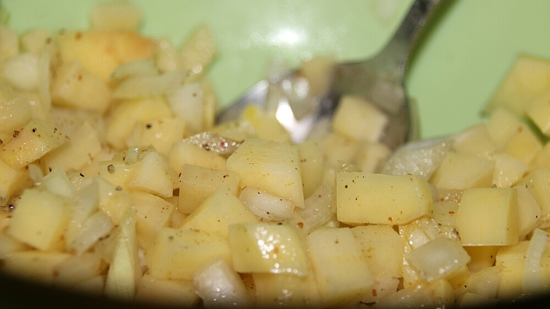 Итак, режем кубиками картошку и репчатый лук (приличное количество). Если используете мясо, нужна телятина или баранина. Начинку перчим, солим, добавляем любимые специи.