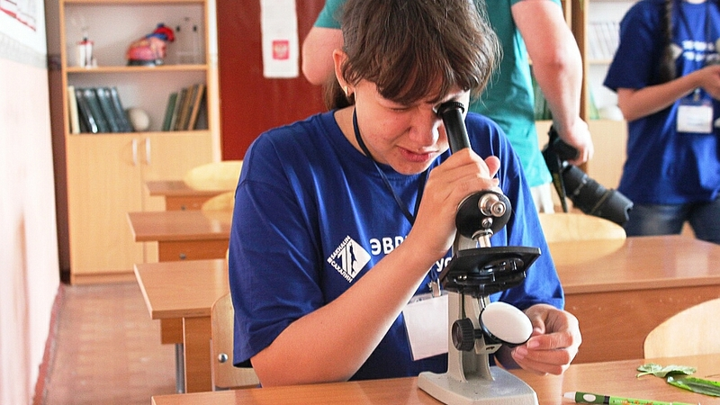 У преподавателя биологии и экологии из СахГУ Ольги Цырендоржиевой эвриканцы изучали под микроскопом листья разных форм, которые сами же и собрали во время прогулки по Томари.