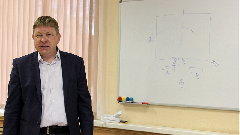 Пока операторы выстраивают картинку, на третьем этаже к игре готовится один из комментаторов – спортивный журналист ОТВ Игорь Антипов. Сегодня его соведущий – тренер ВЦ «Сахалин» Виталий Загний. Комментаторской рубки в волейбольном центре не предусмотрено, поэтому ведущие работают прямо среди зрителей, огородив свое пространство подручными средствами.