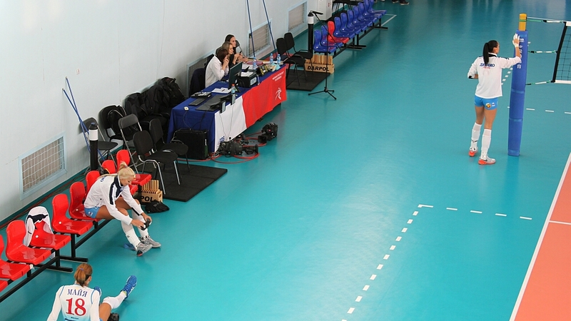 Комментатор в этот момент озвучивает составы команд. К концу представления игроков счет первой партии уже 3:0 в пользу москвичек.