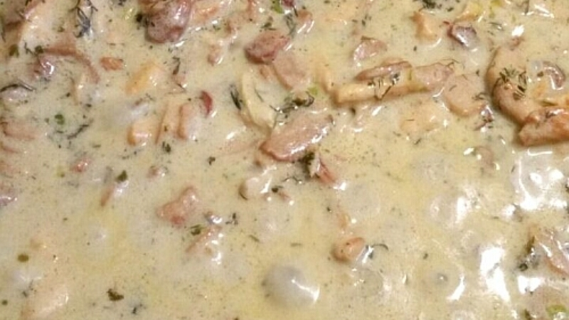 Грибочки обжаривают вместе с куриным филе на сковороде. Далее добавляем в заготовку сметану и зелень – укроп, петрушку, лук, а также солим и перчим по вкусу. Остальные приправы – по желанию.