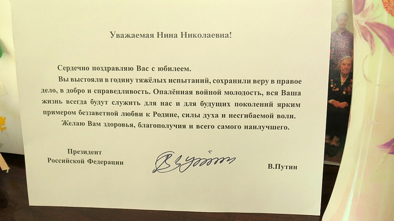 Замминистра вручила букет цветов, ценный подарок и зачитала персональное поздравление от президента России. Приветственные адреса подготовили для именинницы облвоенкомат, Союз ветеранов и другие общественные организации. Все вазы в доме были заняты цветами. На столе росла гора подарков. Нина Николаевна была приятно поражена таким вниманием.
